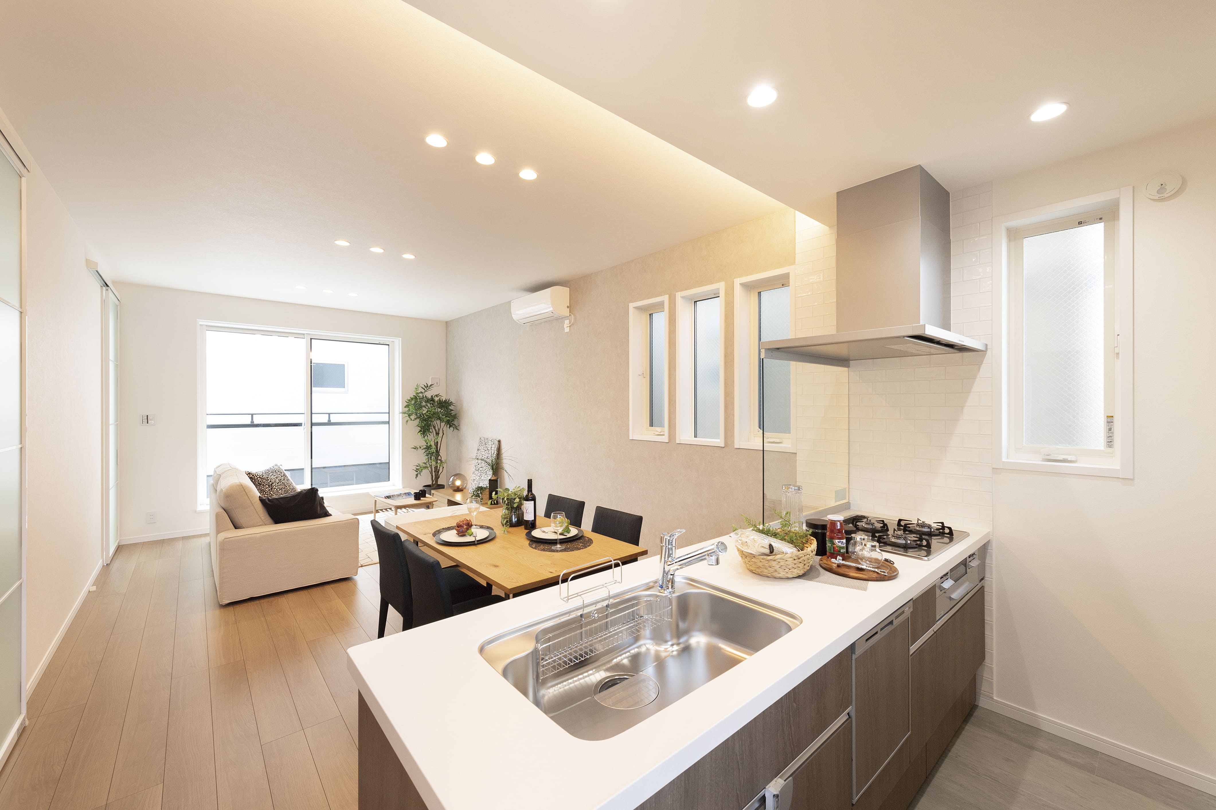 清潔感のあるキッチンは、家族の顔が見渡せるよう開放的な仕様に。